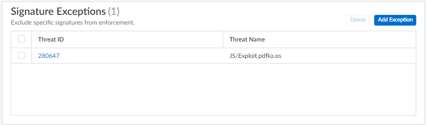 Save the signature exception when you are finished.A valid threat signature ID auto-populates the threat name field. You can view a complete list of active signature exceptions as well as Delete entries that are no longer necessary.