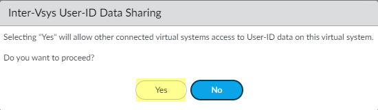 - Select DeviceVirtual Systems and then select the virtual system where you consolidated your User-ID sources.On the Resource tab, Make this vsys a User-ID data hub and click Yes to confirm. Then click OK.