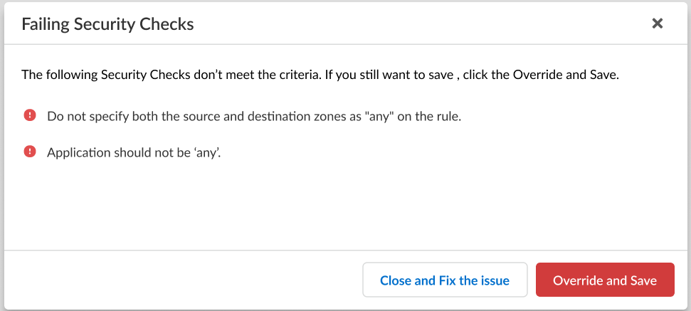 If the configuration you're trying to save doesn't meet the criteria to pass the compliance check, you'll have the option to remediate the issue or override the warning and save the configuration anyway.
