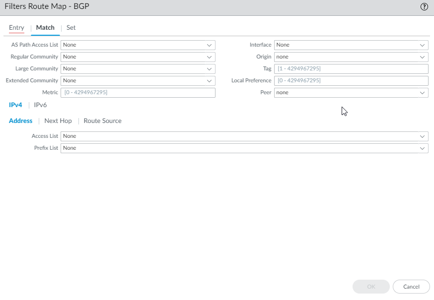 - Configure the BGP route map to match on various types of IPv4 addresses.- On the Address tab, select an Access List to specify addresses to match.
