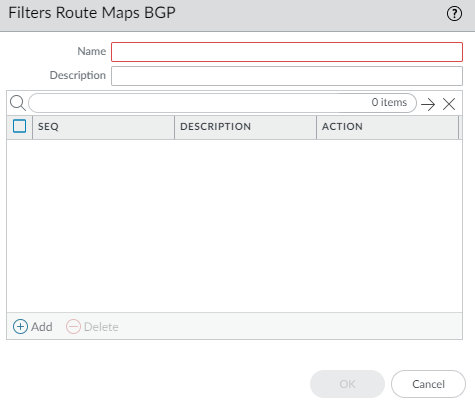 - Enter a Name for the BGP route map.The name must start with an alphanumeric character, underscore (_), or hyphen (-), and can contain a combination of alphanumeric characters, underscore, or hyphen. No dot (.) or space is supported.Add Route Map entry.Configure the BGP route map Entry.- Enter the Seq number of the access list filtering rules in the list of rules for the BGP route map.Range is 1 to 65,535.Leave unused numbers between sequence numbers so you can insert additional rules faster.