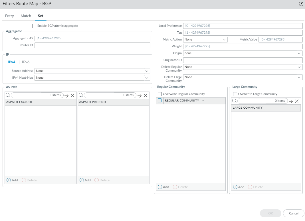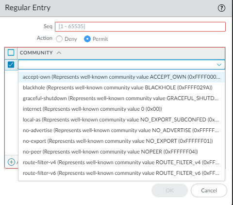 Click OK to save the entry in the Community List. Optionally add more entries of the same type (Regular, Large, or Extended).Click OK to save the Community List.Create a BGP route map.- Select NetworkRoutingRouting ProfilesFilters.Add a Filters Route Maps BGP by Name (maximum of 63 characters). The name must start with an alphanumeric character, underscore (_), or hyphen (-), and can contain a combination of alphanumeric characters, underscore, or hyphen. No dot (.) or space is allowed.Enter a helpful Description of the route map.![]() Add a route map and on the Entry tab, assign a Seq number; range is 1 to 65,535.Assign sequence numbers that are five or more numbers apart so you have unused numbers for which to insert additional entries in the future.Enter a helpful Description of the entry (rule).For Action, select Deny or Permit.On the Match tab, specify the criteria that determine which routes are subject to the function that uses this route map. Multiple attributes are logically ANDed, meaning all criteria must be met. Add a route map and on the Entry tab, assign a Seq number; range is 1 to 65,535.Assign sequence numbers that are five or more numbers apart so you have unused numbers for which to insert additional entries in the future.Enter a helpful Description of the entry (rule).For Action, select Deny or Permit.On the Match tab, specify the criteria that determine which routes are subject to the function that uses this route map. Multiple attributes are logically ANDed, meaning all criteria must be met.![]()  - AS Path Access List—Select an AS path list. Default is None.