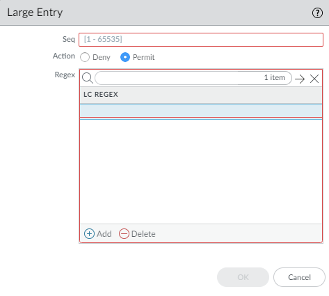 - Large—Add a Seq number (range is 1 to 65,535) and select the Action: Deny (default) or Permit. Add a large community regular expression (LC REGEX) entry. Characters allowed in an entry are 1234567890_^|[,{}()]$*+.?-\. Each community must be in the format regex1:regex2:regex3. Enter a maximum of eight communities in a large entry (rule).