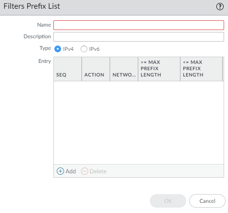 Save.Add Filters Prefix List.- Enter a Name for the prefix list.The name must start with an alphanumeric character, underscore (_), or hyphen (-), and can contain a combination of alphanumeric characters, underscore, or hyphen. No dot (.) or space is supported.Configure the prefix list rule.- Enter the Seq number of the prefix list filtering rules in the list of rules for the prefix list.Range is 1 to 65,535.Leave unused numbers between sequence numbers so you can insert additional rules faster.
