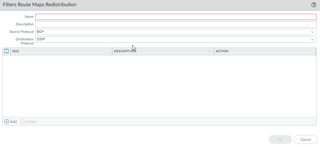 Add the BGP route map entry.Save.Add Filters Route Maps Redistribution.- Enter a Name for the redistribution route map.The name must start with an alphanumeric character, underscore (_), or hyphen (-), and can contain a combination of alphanumeric characters, underscore, or hyphen. No dot (.) or space is supported.Select the Source Protocol. The source protocol is where the Match selections apply.You can select BGP, OSPF, or Connected Static.Select the Destination Protocol. The destination protocol is where the Set selections apply.You can select BGP or OSPF.Add Route Map entry.Configure the redistribution route map Entry.- Enter the