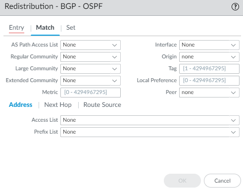 Click OK to save the route map entry. Optionally add more entries.Click OK to save the BGP route map.Create a Redistribution Route Map.- Select NetworkRoutingRouting ProfilesFilters.Add a Filters Route Maps Redistribution by Name (maximum of 63 characters). The name must start with an alphanumeric character, underscore (_), or hyphen (-), and can contain a combination of alphanumeric characters, underscore, or hyphen. No dot (.) or space is allowed.Enter a helpful Description.To redistribute from a Source Protocol, select BGP, OSPF, OSPFv3, RIP, or Connected Static. The source protocol is where the Match selections apply.To redistribute the routes to a Destination Protocol or local RIB, select BGP, OSPF, OSPFv3, RIP, or Rib. The destination protocol is where the Set selections apply. The Destination Protocols available in the dropdown depend on the Source Protocol selected. (This step shows an example of BGP redistributed to OSPF.)![]() Add an Entry and enter the Seq number (range is 1 to 65,535).Enter a helpful Description.Select the Action: Deny or Permit.Select the Match tab to configure criteria for the source protocol; this example specifies BGP attributes to match. Add an Entry and enter the Seq number (range is 1 to 65,535).Enter a helpful Description.Select the Action: Deny or Permit.Select the Match tab to configure criteria for the source protocol; this example specifies BGP attributes to match.![]() Select an AS Path Access List; default is None.Select a Regular Community; default is None.Select a Large Community; default is None.Select an Extended Community; default is None.Enter a Metric; range is 0 to 4,294,967,295.Select an Interface; default is None.Select the Origin of the route: ebgp, ibgp, or incomplete; default is none.Enter a Tag; range is 1 to 4,294,967,295.Enter a Local Preference; range is 0 to 4,294,967,295.Select a Peer name or local (Static or Redistributed routes); default is none.The Address tab refers to the Destination address in a route. Select an Access List to specify routes with a destination address that must match in order to be redistributed. Default is None.Select a Prefix List to specify routes with a destination address that must match in order to be redistributed. Default is None.Select the Set tab to configure actions to perform on routes matching this rule, which will be redistributed to the destination protocol. (In this example, the destination protocol is OSPF.) Select an AS Path Access List; default is None.Select a Regular Community; default is None.Select a Large Community; default is None.Select an Extended Community; default is None.Enter a Metric; range is 0 to 4,294,967,295.Select an Interface; default is None.Select the Origin of the route: ebgp, ibgp, or incomplete; default is none.Enter a Tag; range is 1 to 4,294,967,295.Enter a Local Preference; range is 0 to 4,294,967,295.Select a Peer name or local (Static or Redistributed routes); default is none.The Address tab refers to the Destination address in a route. Select an Access List to specify routes with a destination address that must match in order to be redistributed. Default is None.Select a Prefix List to specify routes with a destination address that must match in order to be redistributed. Default is None.Select the Set tab to configure actions to perform on routes matching this rule, which will be redistributed to the destination protocol. (In this example, the destination protocol is OSPF.)![]() Select the Metric Action for the redistribution rule: you can set the Metric value, add the specified Metric Value to the matching route’s original Metric value, or subtract the specified Metric Value from the matching route’s original Metric value; default is None. Select the add or subtract action to adjust a metric and thus prioritize or deprioritize the matching route.For example, you can put the metric of an IGP into BGP by using redistribution. The metric is dynamic, and you can simply add to its value rather than set it to an absolute number.Enter a Metric Value to set, add to, or subtract from the metric; range is 0 to 4,294,967,295.Select the Metric Type: Type 1 or Type 2 (because this example uses OSPF as the destination protocol).Specify a Tag; range is 1 to 4,294,967,295.Click OK to save the rule. Optionally add more rules.Click OK to save the Redistribution route map. Select the Metric Action for the redistribution rule: you can set the Metric value, add the specified Metric Value to the matching route’s original Metric value, or subtract the specified Metric Value from the matching route’s original Metric value; default is None. Select the add or subtract action to adjust a metric and thus prioritize or deprioritize the matching route.For example, you can put the metric of an IGP into BGP by using redistribution. The metric is dynamic, and you can simply add to its value rather than set it to an absolute number.Enter a Metric Value to set, add to, or subtract from the metric; range is 0 to 4,294,967,295.Select the Metric Type: Type 1 or Type 2 (because this example uses OSPF as the destination protocol).Specify a Tag; range is 1 to 4,294,967,295.Click OK to save the rule. Optionally add more rules.Click OK to save the Redistribution route map.Create Filters for the Advanced Routing Engine (SCM)- Log in to Strata Cloud Manager.Select ConfigurationNGFW and Prisma AccessDevice SettingsRoutingProfilesFilters and select the Configuration Scope where you want to configure a filter.You can select a folder or firewall from your Folders or select Snippets to configure a filter in a snippet.Add Filters Access List.- Enter a Name for the access list.The name must start with an alphanumeric character, underscore (_), or hyphen (-), and can contain a combination of alphanumeric characters, underscore, or hyphen. No dot (.) or space is supported.Add IPv4 entry.Configure the IPv4 access list rule.- Enter the Seq number of the access list filtering rules in the list of rules