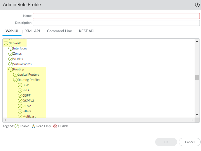 Select Interfaces and configure one or more Layer 3 interfaces with a static IP address or as a DHCPv4 client to received a dynamically assigned address.(Optional) Create an Admin Role Profile to control granular access to logical routers and routing profiles for an Advanced Routing Engine.- Select DeviceAdmin Roles and Add an Admin Role Profile by Name.Select Web UI.Enable, Disable, or select Read Only the following options: Network, Routing, Logical Routers, Routing Profiles, BGP, BFD, OSPF, OSPFv3, RIPv2, Filters, and Multicast (default is Enable).