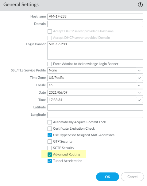 - Select DeviceSetupManagement and edit the General Settings.Enable Advanced Routing.