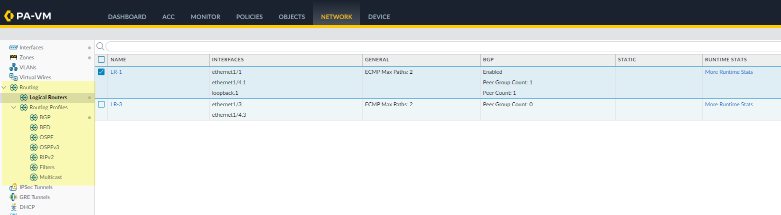 When configuring in Panorama, you can select Network > Virtual Routers to delete all virtual routers. Commit the changes and push them to the relevant firewalls before continuing.Log back into the firewall.Select Network.Notice the menu items, which are more industry-standard and more detailed than the single item (Virtual Routers) on the legacy menu. Routing includes Logical Routers and Routing Profiles, which include BGP, BFD, OSPF, OSPFv3, RIPv2, Filters, and Multicast.