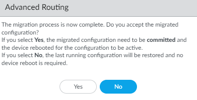 Select Yes to have the migration script convert each virtual router to a logical router and migrate your configuration to the advanced routing engine. (Select Skip to restart the system with an empty configuration. Select Cancel to cancel the process to enable Advanced Routing.)Click OK to approve the migration.