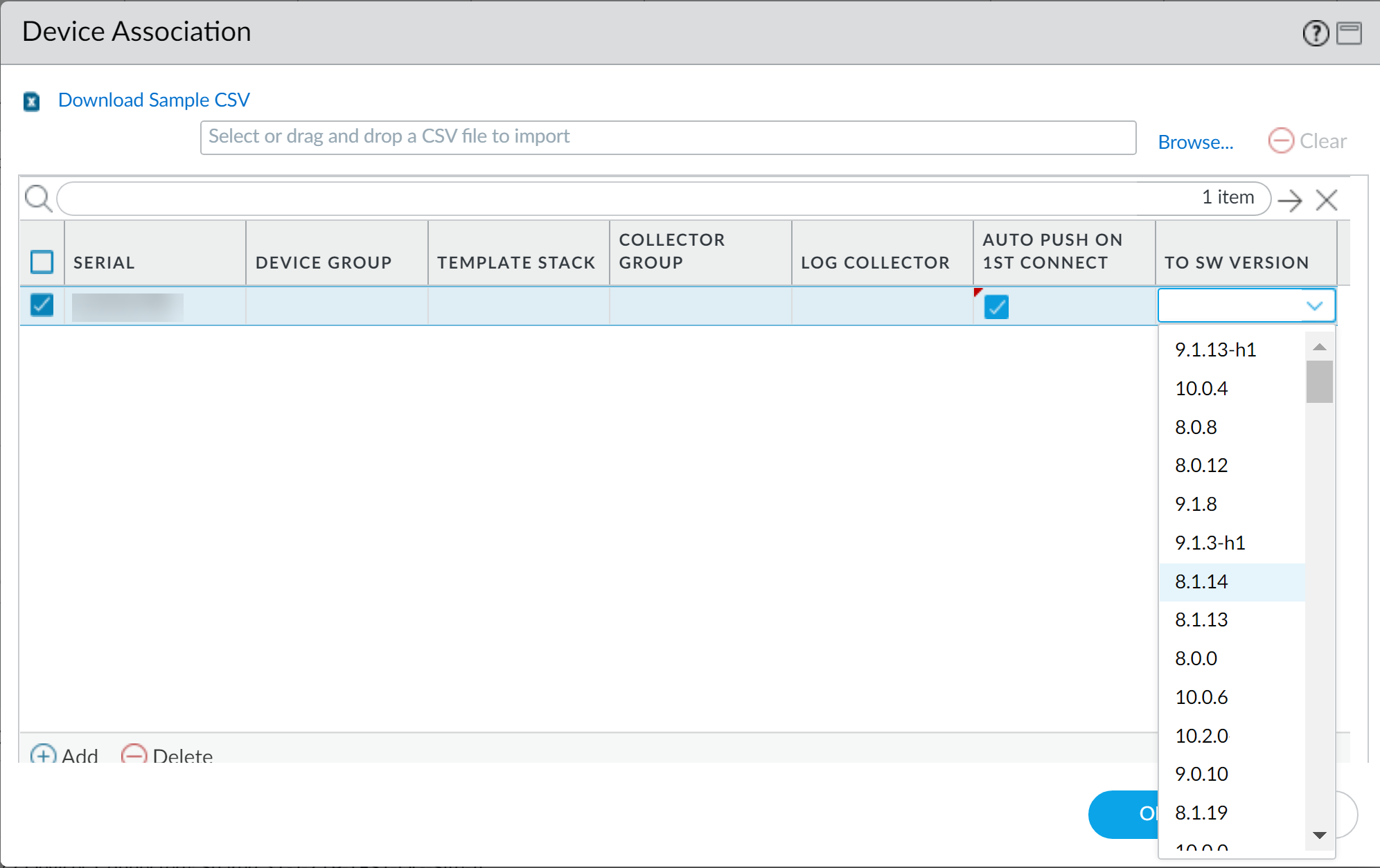 - Log in to the Panorama Web Interface as an admin user.Add a ZTP Firewall to Panorama.Select PanoramaDevice DeploymentUpdates and Check Now for the latest PAN-OS releases.Select PanoramaManaged DevicesSummary and select one or more ZTP firewalls.Reassociate the selected ZTP firewall(s).Check (enable) Auto Push on 1st Connect.In the To SW Version column, select the target PAN-OS version for the ZTP firewall.Click OK to save your configuration changes.