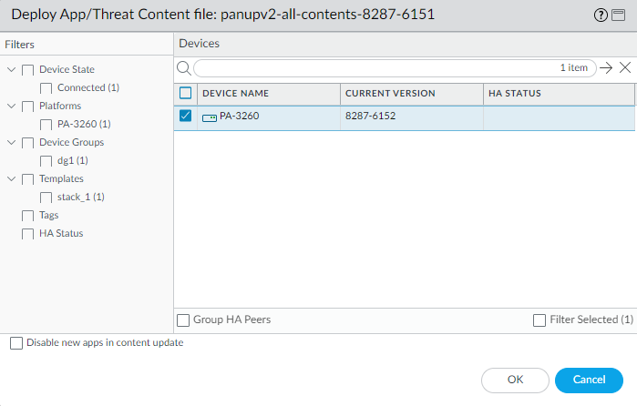 After the firewalls finish rebooting, select PanoramaManaged Devices and verify the Software Version is 10.2.0 for the firewalls you upgraded. Also verify that the HA status of any passive firewalls you upgraded is still passive.(HA firewall upgrades only) Restore HA functionality to the primary HA peer.- Log in to the firewall web interface of suspended primary firewall HA peer.Select DeviceHigh AvailabilityOperational Commands and Make local device functional for high availability.In the bottom-right corner, verify that the state is Passive. For firewalls in an active/active configuration, verify that the state is Active.Wait for the HA peer running configuration to synchronize.In the Dashboard, monitor the Running Config status in the High Availability widget.(HA firewall upgrades only) Suspend the secondary HA peer to force a failover back to the primary HA peer.- Log in to the firewall web interface of active secondary firewall HA peer.Select DeviceHigh AvailabilityOperational Commands and Suspend local device for high availability.In the bottom-right corner, verify that the state is suspended.The resulting failover should cause the primary passive HA peer to transition to active state.The resulting failover verifies that HA failover is functioning properly before you upgrade.(HA firewall upgrades only) Upgrade the second HA peer in each HA pair.- In the Panorama web interface, select PanoramaDevice DeploymentSoftware.Click Install in the Action column that corresponds to the firewall models of the HA pairs you are upgrading.In the Deploy Software file dialog, select all firewalls that you want to upgrade. This time, select only the peers of the HA firewalls you just upgraded.Make sure Group HA Peers is not selected.Select Reboot device after install.To begin the upgrade, click OK.After the installation completes successfully, reboot using one of the following methods:- If you are prompted to reboot, click Yes.