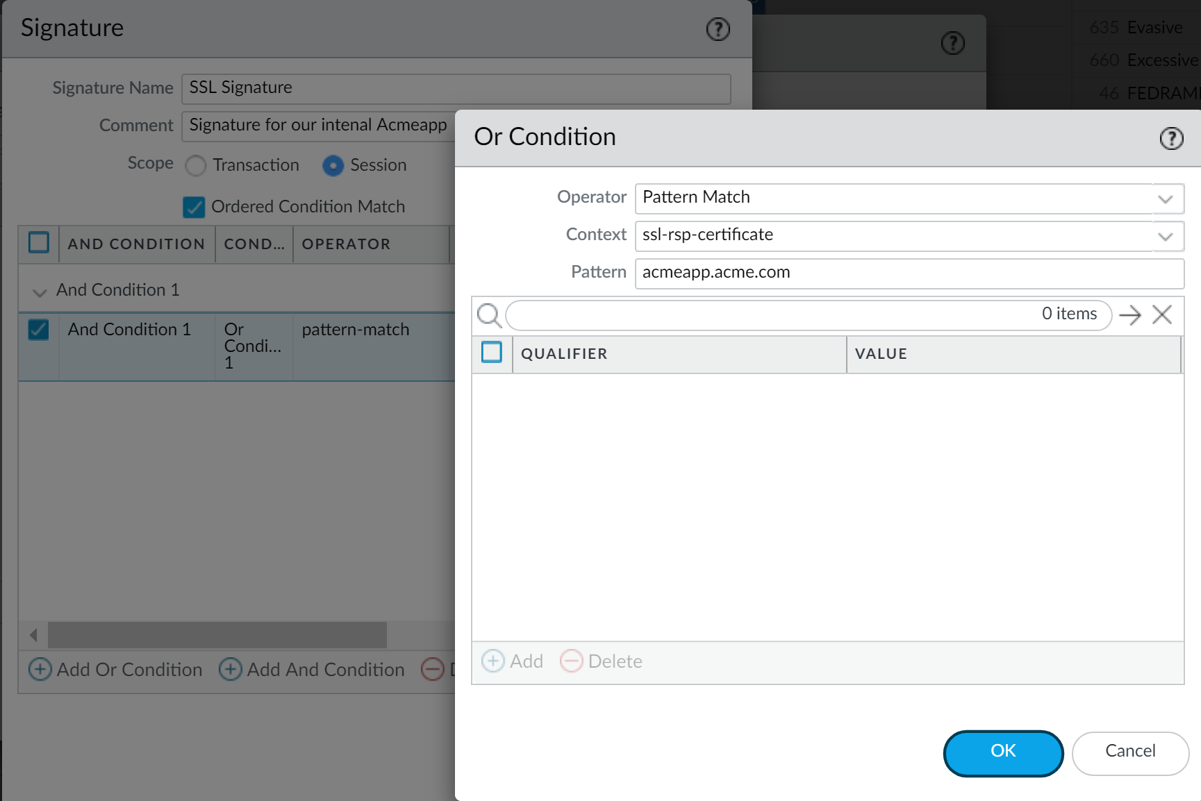 Define the criteria that the firewall will use to match the traffic to the new application.You will use the information you gathered from the packet captures to specify unique string context values that the firewall can use to match patterns in the application traffic.- On the Signatures tab, click Add and define a Signature Name and optionally a Comment to provide information about how you intend to use this signature.Specify the Scope of the signature: whether it matches to a full Session or a single Transaction.Specify conditions to define signatures by clicking Add And Condition or Add Or Condition.Select an Operator to define the type of match conditions you will use: Pattern Match or Equal To.