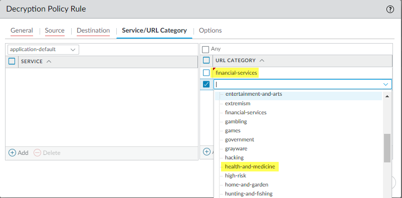 - Select URL Category and Add the URL categories financial-services and health-and-medicine.
