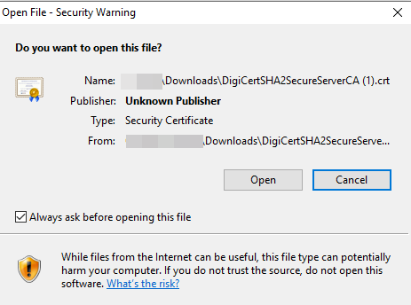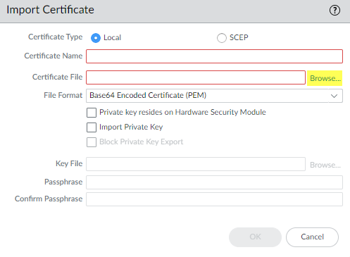Follow the export directions. The certificate copies to the folder you designated as your default download folder.Import the certificate into the firewall.- Navigate to DeviceCertificate ManagementCertificates and then select Import.Browse to the folder where you stored the missing intermediate certificate and select it. Leave the File Format as Base64 Encoded Certificate (PEM).