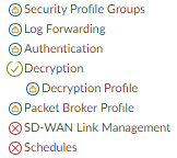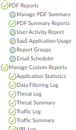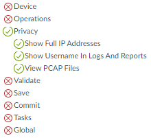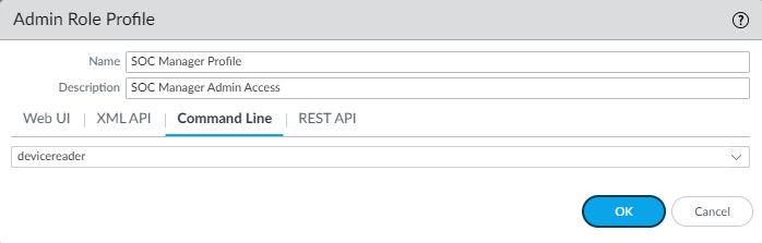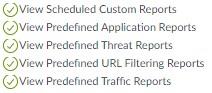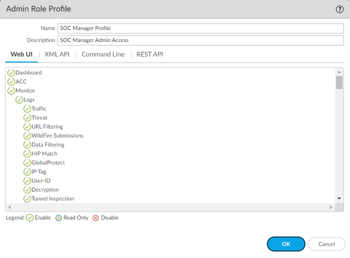 Click OK to save the profile.Assign the role to an administrator. See Configure a Firewall Administrator Account.Example Admin Role Profile ConstructionThis example shows an Admin Role profile for a Security Operations Center (SOC) manager who needs access to investigate potential issues. The SOC Manager needs read access to many areas of the firewall, but generally doesn’t need write access. The example covers all four of the Admin Role Profile’s tabs and each step describes why the profile enables or disables a particular area of access to the SOC manager.This is an example profile for a fictional SOC manager. Configure Admin Role profiles for your administrators based on the functions they manage and the access required to do their job. Do not enable unnecessary access. Create separate profiles for each administrative group that shares the same duties and for administrators who have unique duties. Each administrator should have the exact level of access required to perform their duties and no access beyond that.- Configure Web UI access permissions. Each snip of the Web UI screen shows a different area of Web UI permissions. Permissions are listed by firewall tab, in the order you see the tabs in the Web UI, followed by permissions for other actions.The Dashboard, ACC, and MonitorLogs areas of the firewall don’t contain configuration elements—all of the objects are informational (you can only toggle them between enable and disable because they are already read only). Because the SOC Manager needs to investigate potential issues, the SOC Manager needs access to the information on these tabs.The profile name and description make it easy to understand the profile’s objective. This snip doesn’t show all of the Logs permissions, but all of them are enabled for this profile.![]() The next snip shows permissions for more informational objects on the Monitor tab. The SOC Manager uses these tools to investigate potential issues and therefore requires access. The next snip shows permissions for more informational objects on the Monitor tab. The SOC Manager uses these tools to investigate potential issues and therefore requires access.![]() The next two snips show permissions for PDF Reports, Custom Reports, and predefined reports on the Monitor tab. While the SOC Manager needs access to PDF reports to gather information, in this example, the SOC Manager does not need to configure reports, so access is set to read-only (summary reports are not configurable). However, the SOC Manager needs to manage custom reports to investigate specific potential issues, so full access permissions are granted for all custom reports (including those not shown in the snip). Finally the SOC Manager requires access to predefined reports for investigating potential issues. The next two snips show permissions for PDF Reports, Custom Reports, and predefined reports on the Monitor tab. While the SOC Manager needs access to PDF reports to gather information, in this example, the SOC Manager does not need to configure reports, so access is set to read-only (summary reports are not configurable). However, the SOC Manager needs to manage custom reports to investigate specific potential issues, so full access permissions are granted for all custom reports (including those not shown in the snip). Finally the SOC Manager requires access to predefined reports for investigating potential issues.![]()  ![]() Because the SOC Manager is an investigator and not an administrator who configures the firewall, permissions for the Policies tab are read-only, with the exception of resetting the rule hit count. Resetting the rule hit count is not one of the SOC Manager’s duties (and changing the hit count could adversely affect or confuse other administrators), so access is disabled. Read access enables the SOC Manager to investigate the construction of a policy that the SOC Manager suspects may have caused an issue. Because the SOC Manager is an investigator and not an administrator who configures the firewall, permissions for the Policies tab are read-only, with the exception of resetting the rule hit count. Resetting the rule hit count is not one of the SOC Manager’s duties (and changing the hit count could adversely affect or confuse other administrators), so access is disabled. Read access enables the SOC Manager to investigate the construction of a policy that the SOC Manager suspects may have caused an issue.![]() Permissions for the Objects tab are also read-only for the same reason—the SOC Manager’s job doesn’t require configuration, so no configuration permissions are assigned. For areas that aren’t included in the SOC Manager’s duties, access is disabled. In this example, the SOC Manager has read-only access to investigate objects configurations for all objects except URL Filtering, SD-WAN Link Management and Schedules, which are under the control of different administrators in this example. Permissions for the Objects tab are also read-only for the same reason—the SOC Manager’s job doesn’t require configuration, so no configuration permissions are assigned. For areas that aren’t included in the SOC Manager’s duties, access is disabled. In this example, the SOC Manager has read-only access to investigate objects configurations for all objects except URL Filtering, SD-WAN Link Management and Schedules, which are under the control of different administrators in this example.![]()  ![]()  ![]() For Network tab permissions, the scenario is similar: the SOC Manager doesn’t need to configure any of the objects, but may need information to investigate issues, so read-only access is assigned to the areas that the SOC Manager may need to investigate. In this example, access is disabled for QoS, LLDP, Network Profiles, or SD-WAN Interface profiles because these items are not part of the SOC Manager’s duties. For Network tab permissions, the scenario is similar: the SOC Manager doesn’t need to conf