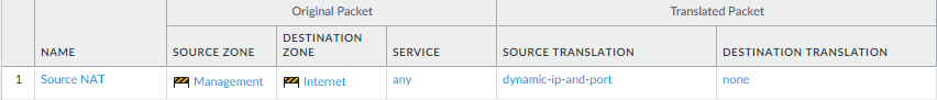 Create a NAT policy rule.- If you are using a private IP address on the internal-facing interface, you will need to create a source NAT rule to translate the address to a publicly routable address. Select PoliciesNAT and then click Add. At a minimum you must define a name for the rule (General tab), specify a source and destination zone, Management to Internet in this case (Original Packet tab), and define the source address translation settings (Translated Packet tab) and then click OK.Commit your changes.