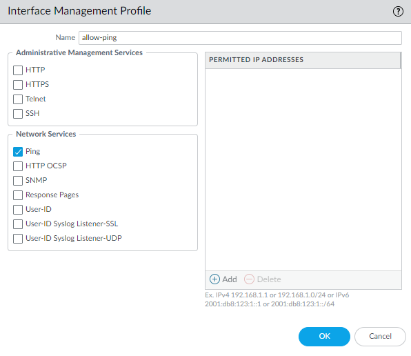 Select AdvancedOther Info, expand the Management Profile drop-down, and select New Management Profile.Enter a Name for the profile, such as allow_ping, and then select the services you want to allow on the interface. For the purposes of allowing access to the external services, you probably only need to enable Ping and then click OK.These services provide management access to the firewall, so only select the services that correspond to the management activities you want to allow on this interface. For example, don’t enable HTTP or Telnet because those protocols transmit in plaintext and therefore aren’t secure. Or if you plan to use the MGT interface for firewall configuration tasks through the web interface or CLI, you don’t enable HTTP, HTTPS, SSH, or Telnet so that you prevent unauthorized access through the interface (if you must allow HTTPS or SSH in this scenario, limit access to a specific set of Permitted IP Addresses). For details, see Use Interface Management Profiles to Restrict Access.