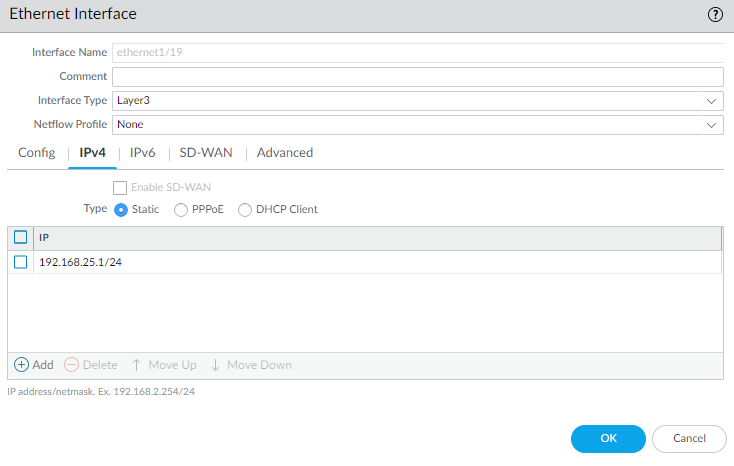 - Select NetworkInterfaces and select the interface that corresponds to the interface you cabled in Step 1.Select the Interface Type. Although your choice here depends on your network topology, this example shows the steps for Layer3.On the Config tab, expand the Security Zone drop-down and select New Zone.In the Zone dialog, enter a Name for new zone, for example Management, and then click OK.Select the IPv4 tab, select the Static radio button, and click Add in the IP section, and enter the IP address and network mask to assign to the interface, for example 192.168.1.254/24. You must use a static IP address on this interface.