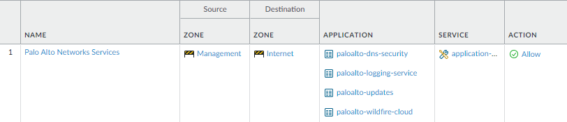 Click OK to save the settings.Repeat Steps 5.2 - 5.3 above for each service route you want to modify.Commit your changes.Configure an external-facing interface and an associated zone and then create a security policy rule to allow the firewall to send service requests from the internal zone to the external zone.- Select NetworkInterfaces and then select the external-facing interface. Select Layer3 as the Interface Type, Add the IP address (on the IPv4 or IPv6 tab), and create the associated Security Zone (on the Config tab), such as Internet. This interface must have a static IP address; you do not need to set up management services on this interface.To set up a security rule that allows traffic from your internal network to the Palo Alto Networks update server, select PoliciesSecurity and click Add.As a best practice when creating Security policy rules, use application-based rules instead of port-based rules to ensure that you are accurately identifying the underlying application regardless of the port, protocol, evasive tactics, or encryption in use. Always leave the Service set to application-default. In this case, create a security policy rule that allows access to the update server (and other Palo Alto Networks services).