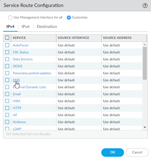 For the purposes of activating your licenses and getting the most recent content and software updates, you will want to change the service route for DNS, Palo Alto Networks Services, URL Updates, and AutoFocus.Click the Customize radio button, and select one of the following:- For a predefined service, select IPv4 or IPv6 and click the link for the service. To limit the drop-down list for Source Address, select Source Interface and select the interface you just configured. Then select a Source Address (from that interface) as the service route.If more than one IP address is configured for the selected interface, the Source Address drop-down allows you to select an IP address.