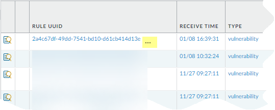 Copy the UUID for a log or policy rule.Copying the UUID allows you to paste the UUID in to searches, the ACC, custom reports, filters, and anywhere else you want to locate a rule identified by that UUID.- Select the ellipses that display when you move your cursor over the entry in the Rule UUID column.