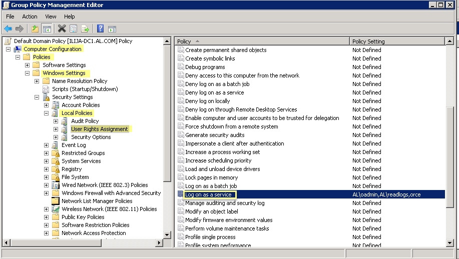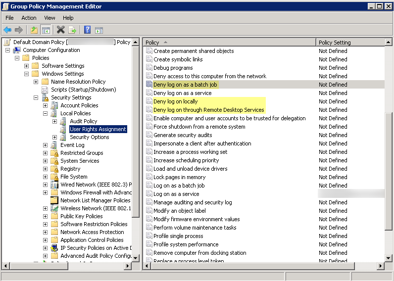 - Select Group Policy Management EditorDefault Domain PolicyComputer ConfigurationPoliciesWindows SettingsSecurity SettingsUser Rights Assignment.