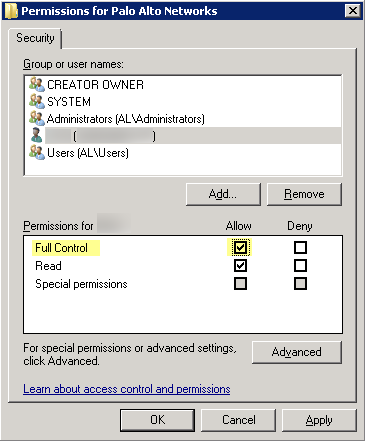 Click OK twice to save the settings.Confirm that the builtin Event Log Reader group lists the service account as a member (Event Log ReadersPropertiesMembers).Assign account permissions to the installation folder to allow the service account to access the agent’s installation folder to read the configuration and write logs.You only need to perform this step if the service account you configured for the User-ID agent is not a domain administrator or a local administrator on the User-ID agent server host.- From the Windows Explorer, navigate to C:\Program Files(x86)\Palo Alto Networks, right-click the folder, and select Properties.On the Security tab, click Edit.