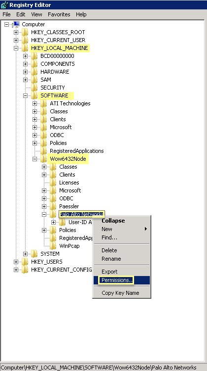 If you do not want to configure individual permissions, you can Allow the Full Control permission instead.To allow the agent to make configuration changes (for example, if you select a different logging level), give the service account permissions to the User-ID agent registry sub-tree.- Select StartRun and enter regedt32 and navigate to the Palo Alto Networks sub-tree in HKEY_LOCAL_MACHINE\Software\WOW6432Node\PaloAlto Networks.Right-click the Palo Alto Networks node and select Permissions.