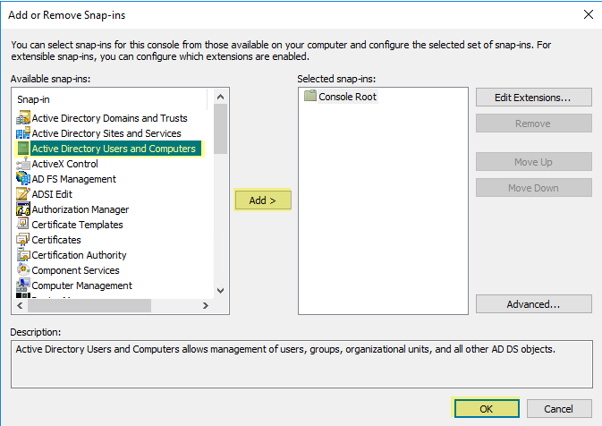 - StartRun, enter MMC, and select FileAdd/Remove Snap-inActive Directory Users and ComputersUsers.