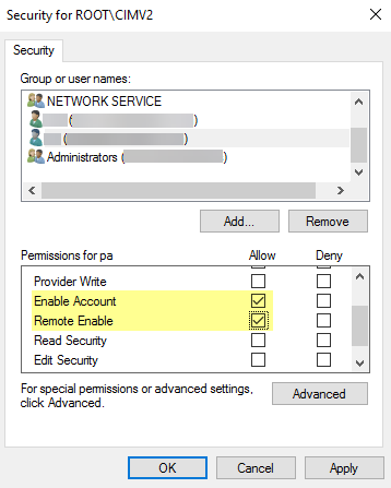 Add the name of the service account you created, Check Names to verify your entry, and click OK.You might have to change the Locations or click Advanced to query for account names. See the dialog help for details.In the Permissions for <Username> section, Allow the Enable Account and Remote Enable permissions.