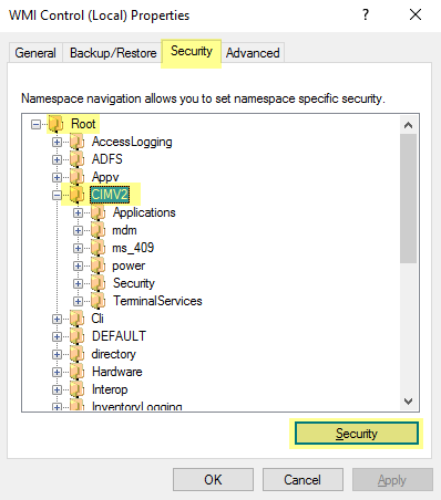 Select the Security tab, then select RootCIMV2, and click the Security button.