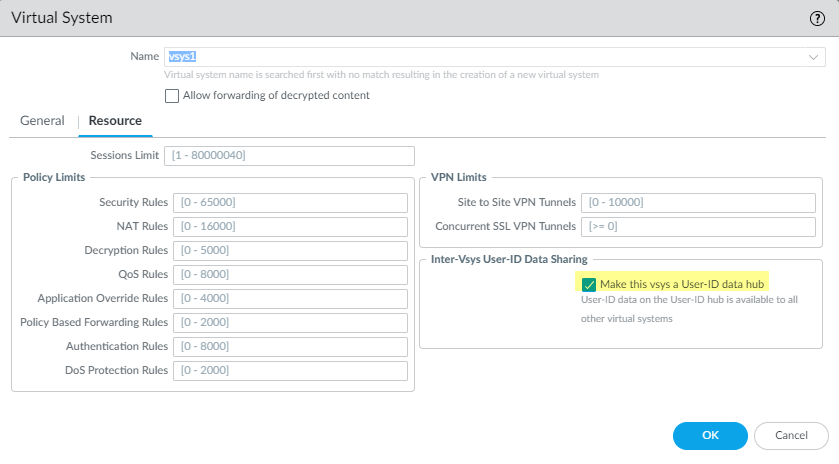 sessions, rules, and VPN tunnels allowed for the virtual system.