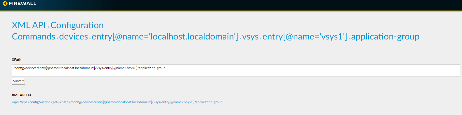 Select Configuration Commands.Drill down until you find the configuration object you want to load from one configuration to another.For example, to find the application group xpath on a multi-vsys firewall, you would select Configuration Commandsdeviceslocalhost.localdomainvsys > <vsys-name>application-group. After you drill down to the node you want to load, make note of the XPath that is displayed in the text box.