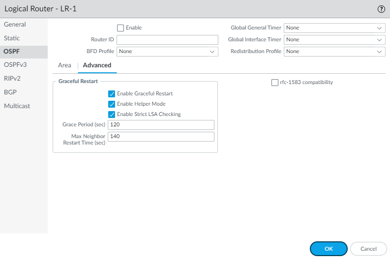 Select the transit Area where the neighbor ABR that has the physical link to the backbone area is located.Enter the Router ID of the neighbor ABR on the remote end of the virtual link.Select a Timer Profile or create a new Timer Profile to apply to the virtual link. This OSPF Interface Timer profile overrides the Global Interface Timer applied to OSPF and the OSPF Interface Timer profile applied to the interface.Select an Authentication profile or create a new Authentication Profile to apply to the virtual link. This Authentication Profile overrides the Authentication Profile applied to the Area (on the Type tab) and the Authentication Profile applied to the interface.Click OK.Click OK to save the area.Configure OSPF Graceful Restart and RFC 1583 compatibility for OSPFv2.- Select NetworkRoutingLogical Routers and select the logical router.Select OSPFAdvanced.Select rfc-1583 compatibility to enforce compatibility with RFC 1583, which allows one best route to an autonomous system boundary router (ASBR) in the OSPF routing table. Default is disabled, which means the OSPF routing table can maintain multiple intra-AS paths in the routing table, thereby preventing routing loops.