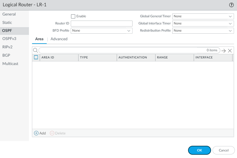 Enter the Router ID in the format of an IPv4 address.If you want to apply BFD to OSPF, select a BFD Profile you created, or select the default profile, or create a new BFD Profile. Default is None (Disable BFD).Select an OSPF Global General Timer profile or create a new one.Select an OSPF Global Interface Timer profile or create a new one.Select an OSPF Redistribution Profile or create a new one to redistribute IPv4 static routes, connected routes, RIPv2 routes, IPv4 BGP routes, or the IPv4 default route to OSPF.Create an OSPF area and specify characteristics based on the type of area.- Select Area and Add an area identified by its Area ID in x.x.x.x format. This is the identifier that each neighbor must accept to be part of the same area.Select the Type tab and for Authentication, select an Authentication profile or create a new Authentication profile.Select the Type of area: