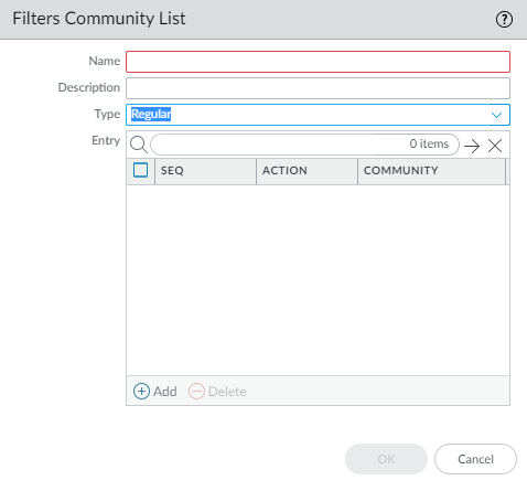 Click OK to save the entry. Optionally add more entries; a maximum of 64 entries are allowed in an AS Path access list.Click OK to save the AS Path access list.Create a Community List.- Select NetworkRoutingRouting ProfilesFilters.Add a Filters Community List by Name (maximum of 63 characters). The name must start with an alphanumeric character, underscore (_), or hyphen (-), and can contain a combination of alphanumeric characters, underscore, or hyphen. No dot (.) or space is allowed.Enter a helpful Description.