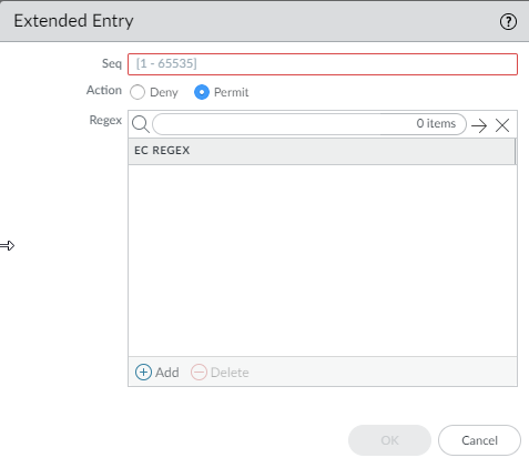 Add an Entry and enter the Seq number (range is 1 to 65,535).Enter a helpful Description.Select the Action: Deny or Permit.Select the Match tab to configure criteria for the source protocol; this example specifies BGP attributes to match.