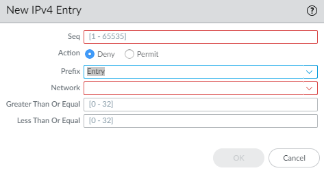 - For Prefix, there are three options; default is None. Another option is to select Network any. The third option is to select Entry and enter an IPv4 Network prefix with slash and a base prefix length that together specify a network, for example, 192.168.2.0/24. Optionally specify that the prefix length be Greater Than Or Equal to a number (that is at least as large as the base length you specified; range is 0 to 32). Optionally specify a top limit to the range by specifying Less Than Or Equal to a number (that is at least as high as the base length and at least as high as the Greater Than Or Equal length if configured; range is 0 to 32).