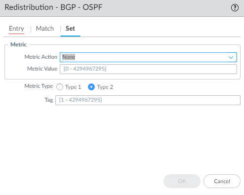 Select the Metric Action for the redistribution rule: you can set the Metric value, add the specified Metric Value to the matching route’s original Metric value, or subtract the specified Metric Value from the matching route’s original Metric value; default is None. Select the add or subtract action to adjust a metric and thus prioritize or deprioritize the matching route.For example, you can put the metric of an IGP into BGP by using redistribution. The metric is dynamic, and you can simply add to its value rather than set it to an absolute number.Enter a Metric Value to set, add to, or subtract from the metric; range is 0 to 4,294,967,295.Select the Metric Type: Type 1 or Type 2 (because this example uses OSPF as the destination protocol).Specify a Tag; range is 1 to 4,294,967,295.Click OK to save the rule. Optionally add more rules.Click OK to save the Redistribution route map.
