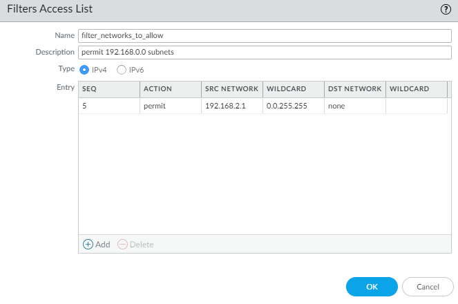 Click OK to save the access list.Create a prefix list.- Select NetworkRoutingRouting ProfilesFilters.Add a Filters Prefix List by Name (maximum of 63 characters). The name must start with an alphanumeric character, underscore (_), or hyphen (-), and can contain a combination of alphanumeric characters, underscore, or hyphen. No dot (.) or space is allowed.Enter a helpful Description.Select the Type of prefix for this rule to filter: IPv4 or IPv6.