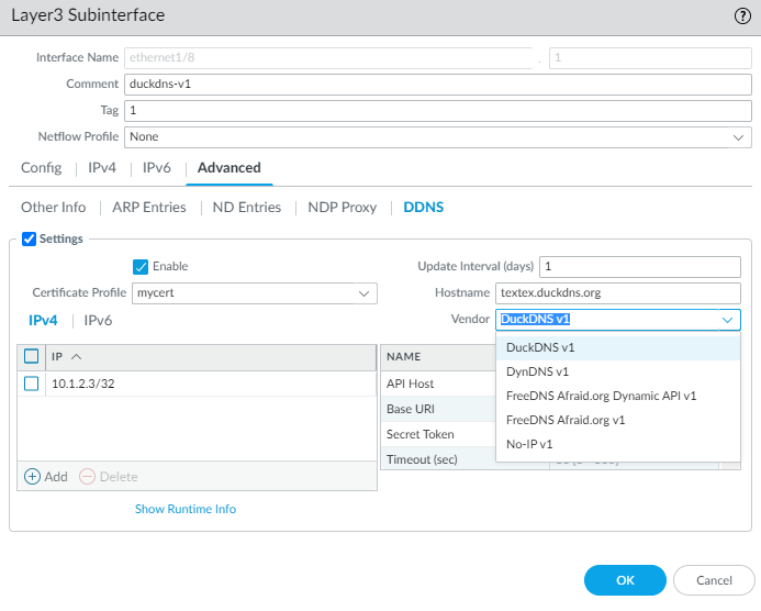 - Select NetworkInterfacesEthernet and select a Layer 3 interface, subinterface, or Aggregate Ethernet (AE) interface; or select NetworkInterfacesVLAN and select an interface or subinterface.Select AdvancedDDNS and select Settings.Enable DDNS. You must initially enable DDNS to configure it. (If your DDNS configuration is unfinished, you can save it without enabling it so that you do not lose your partial configuration.)Enter the Update Interval (days), which is the number of days between updates that the firewall sends to the DDNS service to update IP addresses mapped to FQDNs (default is 1; range is 1 to 30). Choose an interval based on how frequently your IP addresses change. (The updates that the firewall sends at regular intervals are in addition to the updates the firewall sends upon receiving an address change. The updates sent at regular intervals are to ensure that updates sent per address change are not lost, for example.)Enter the Hostname for the interface, which is already registered with the DDNS service (for example, www.serverA.companyx.com or serverA).Make sure this hostname matches the hostname you registered with your DDNS service. You should enter an FQDN for the hostname; the firewall doesn’t validate the hostname except to confirm that the syntax uses only valid characters allowed by DNS for a domain name.Select IPv4 and select one or more IPv4 addresses assigned to the interface or Add an IPv4 address to associate with the hostname (for example, 10.1.1.1). You can select only as many IPv4 addresses as the DDNS service allows. All selected IPv4 addresses are registered with the DDNS service. Select at least one IPv4 or one IPv6 address.Select IPv6 and select one or more IPv6 addresses assigned to the interface or Add an IPv6 address to associate with the hostname. You can select only as many IPv6 addresses as the DDNS service allows. All selected IPv6 addresses are registered with the DDNS service. Select at least one IPv4 or one IPv6 address.Select or create a new certificate profile (Certificate Profile) using the imported SSL certificate from the DDNS service to verify the SSL certificate of the DDNS service when the firewall first connects to a DDNS service to register an IP address and at every update. When the firewall connects to the DDNS service to send updates, the DDNS service presents the firewall with an SSL certificate signed by the certificate authority (CA) so that the firewall can authenticate the DDNS service.Select the Vendor (and version number) you are using for DDNS service.