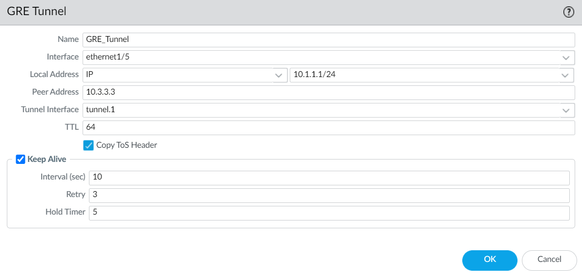 (Best Practice) Enable the Keep Alive function for the GRE tunnel.If Keep Alive is enabled, by default it takes three unreturned keepalive packets (Retries) at 10-second intervals for the GRE tunnel to go down and it takes five Hold Timer intervals at 10-second intervals for the GRE tunnel to come back up.- Select Keep Alive to enable the keepalive function for the GRE tunnel (default is disabled).(Optional) Set the Interval (sec) (in seconds) between keepalive packets that the local end of the GRE tunnel sends to the tunnel peer. This is also the interval that, when multiplied by the Hold Timer, is the length of time that the firewall must see successful keepalive packets before the GRE tunnel comes back up (range is 1 to 50; default is 10). Setting an interval too small will cause many keepalive packets that might be unnecessary in your environment and will require extra bandwidth and processing. Setting an interval too large can delay failover because error conditions might not be identified immediately.(Optional) Enter the Retry setting, which is the number of intervals that keepalive packets are not returned before the firewall considers the tunnel peer down (range is 1 to 255; default is 3). When the tunnel is down, the firewall removes routes associated with the tunnel from the forwarding table. Configuring a retry setting helps avoid taking measures on a tunnel that is not really down.(Optional) Set the Hold Timer, which is the number of Intervals that keepalive packets are successful, after which the firewall re-establishes communication with the tunnel peer (range is 1 to 64; default is 5).Click OK.Configure a routing protocol or static route to route traffic to the destination by way of the GRE tunnel. For example, Configure a Static Route to the network of the destination server and specify the egress Interface to be the local tunnel endpoint (tunnel.1). Configure the Next Hop to be the IP address of the tunnel at the opposite end. For example, 192.168.2.3.Commit your changes.Configure the opposite end of the tunnel with its public IP address, its local and peer IP addresses (that correspond to the peer and local IP addresses, respectively, of the GRE tunnel on the firewall), and its routing protocol or static route.Verify that the firewall can communicate with the tunnel peer over the GRE tunnel.