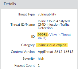 Select a log entry to view the details of a vulnerability exploit.The threat Category is displayed under the Details pane of the detailed log view. Vulnerability exploits that have been detected using inline cloud analysis have a threat category of inline-cloud-exploit.