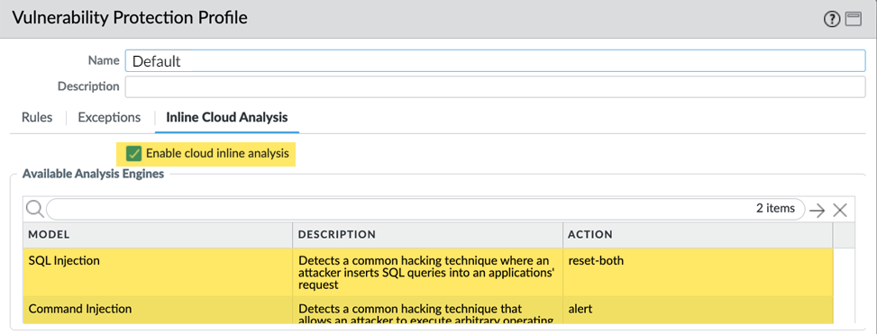 - Specify an Action to take when a vulnerability exploit is detected using a corresponding analysis engine. There are currently two analysis engines available: SQL Injection and Command Injection.