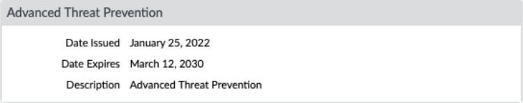 - Log in to the PAN-OS web interface.To take advantage of inline cloud analysis of vulnerability exploits, you must have an active Advanced Threat Prevention subscription.To verify subscriptions for which you have currently-active licenses, select DeviceLicenses and verify that the appropriate licenses are available and have not expired.