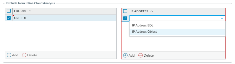 (Optional) Add URL and/or IP address exceptions to your Vulnerability Protection profile if Inline Cloud Analysis produces false-positives. You can add exceptions by specifying an external dynamic list (URL or IP address list types) or an Addresses object.- Add an External Dynamic Lists or [IP] Addresses object exception.