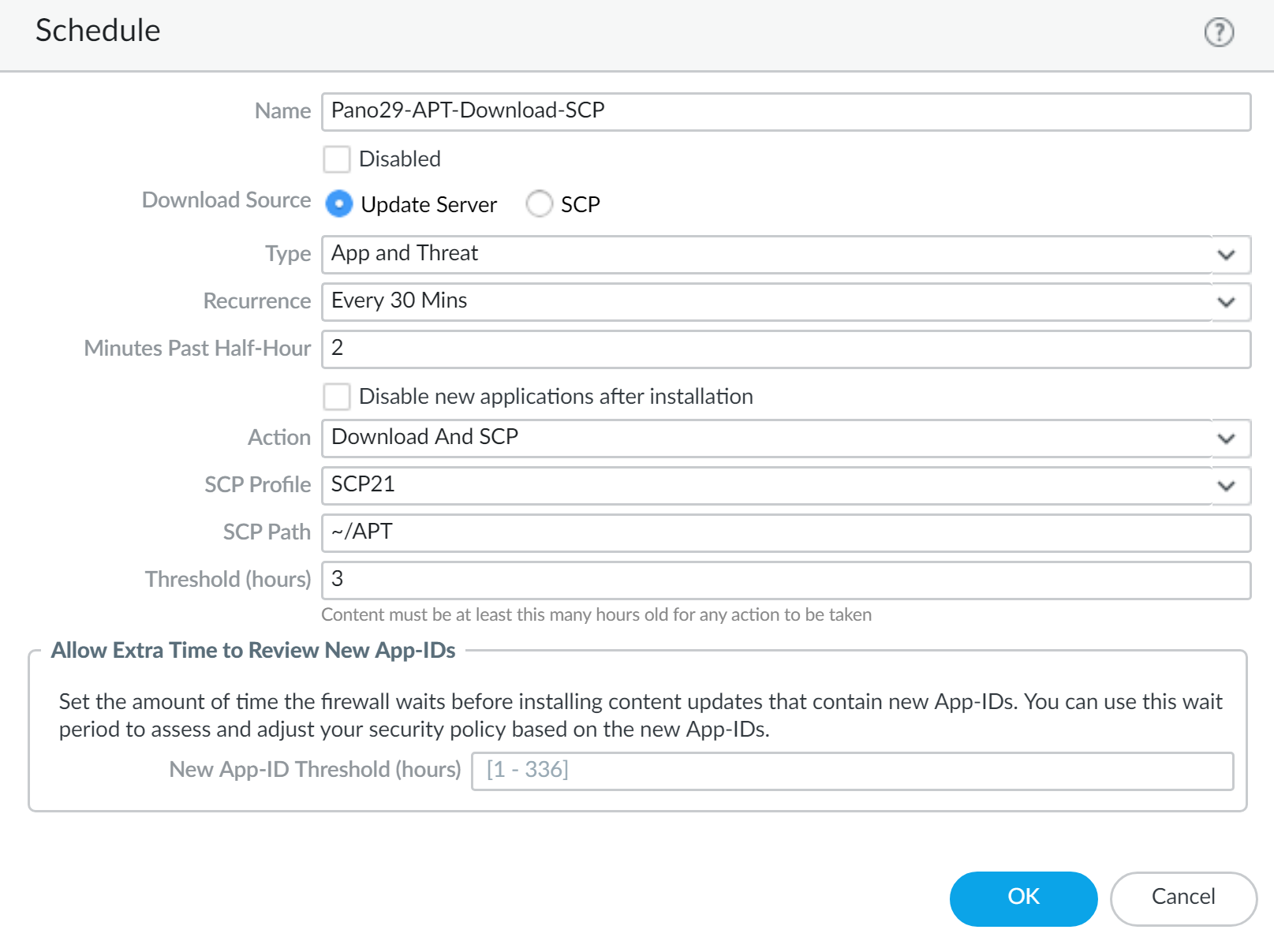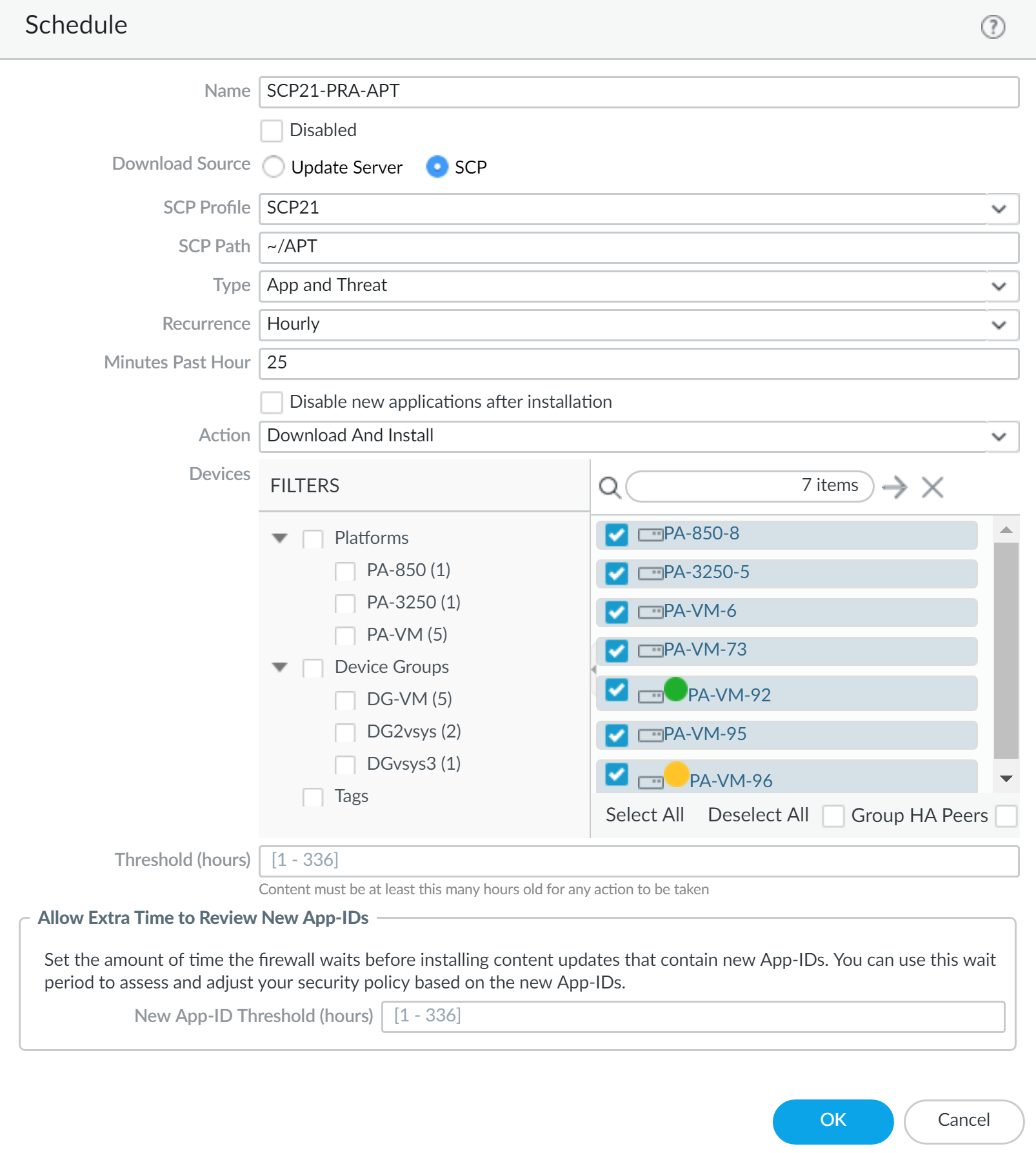 - (Optional) Enter the Threshold, in hours, for the content updates. Panorama downloads only content updates that are this number of hours old (or older)