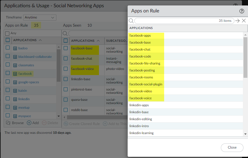 - Click the number next to Apps on Rule to see all of the individual applications on the rule.This example rule has 10 Apps Seen (applications that matched the rule) but allows 35 Apps on Rule. The facebook container app is configured on the rule and the rule sees traffic from the individual applications facebook-base, facebook-chat, and facebook-video (Apps Seen). When you click the Apps on Rule number, the Apps on Rule dialog displays the individual applications allowed, but not the container app itself.