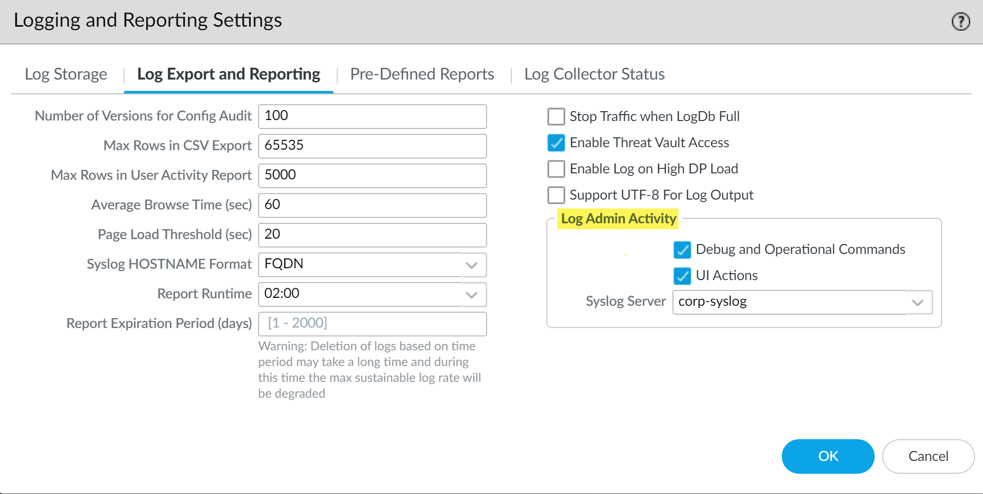- Select DeviceSetupManagement and edit the Logging and Reporting Settings.Select Log Export and Reporting.In the Log Admin Activity section, configure what administrator activity to track.